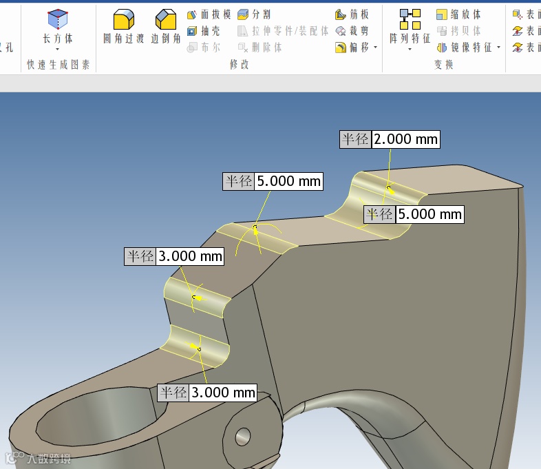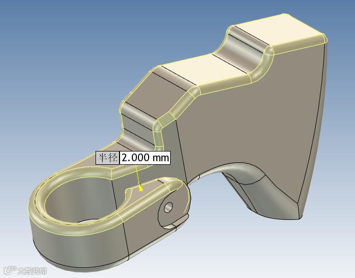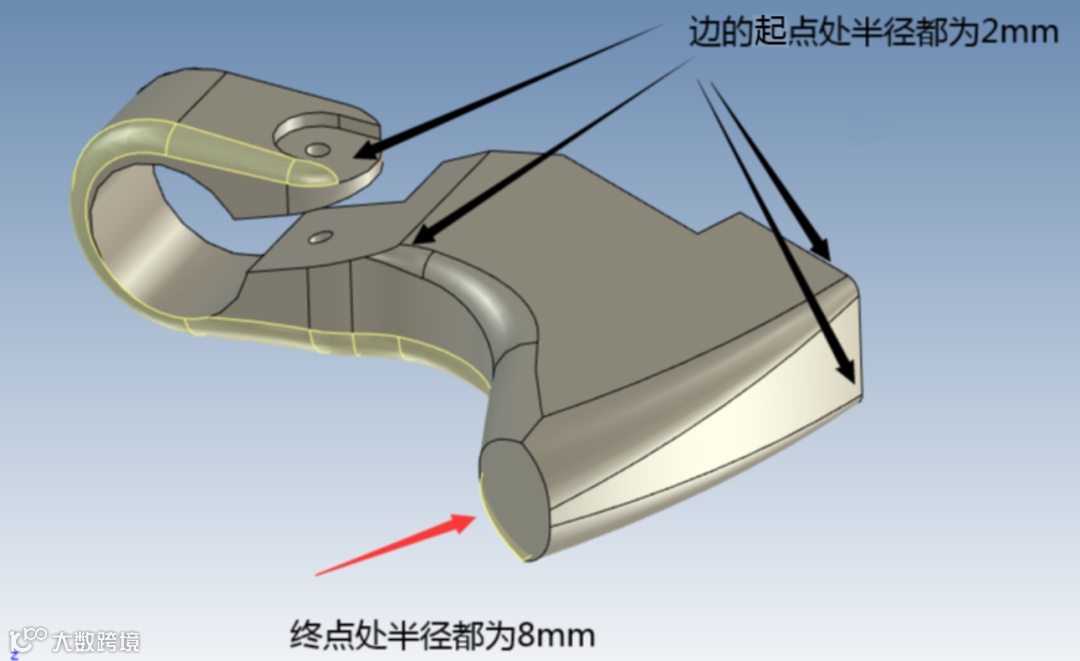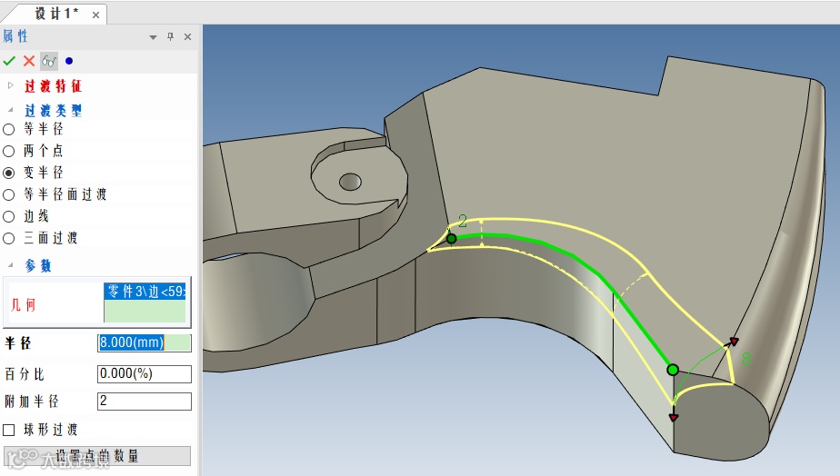 30、再作变半径圆角过渡,起点处过渡半径为2mm,终点处过渡半径为8mm。