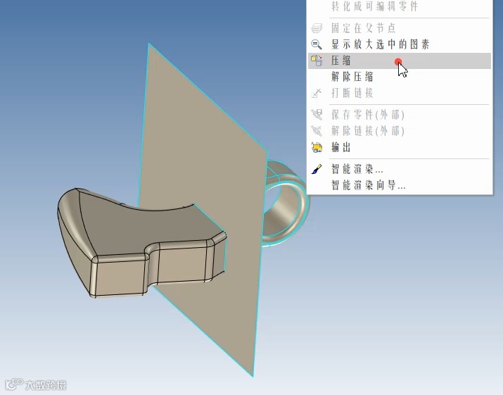 37、将曲面和分割后的其中一个零件选中,单击鼠标右键,选择压缩/隐藏。