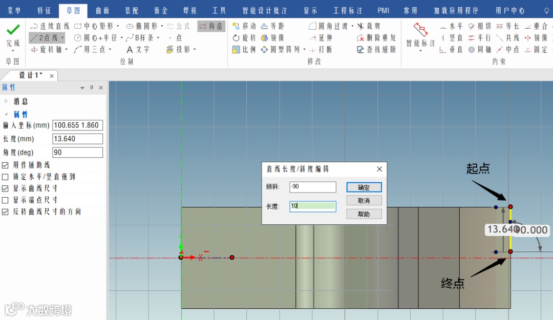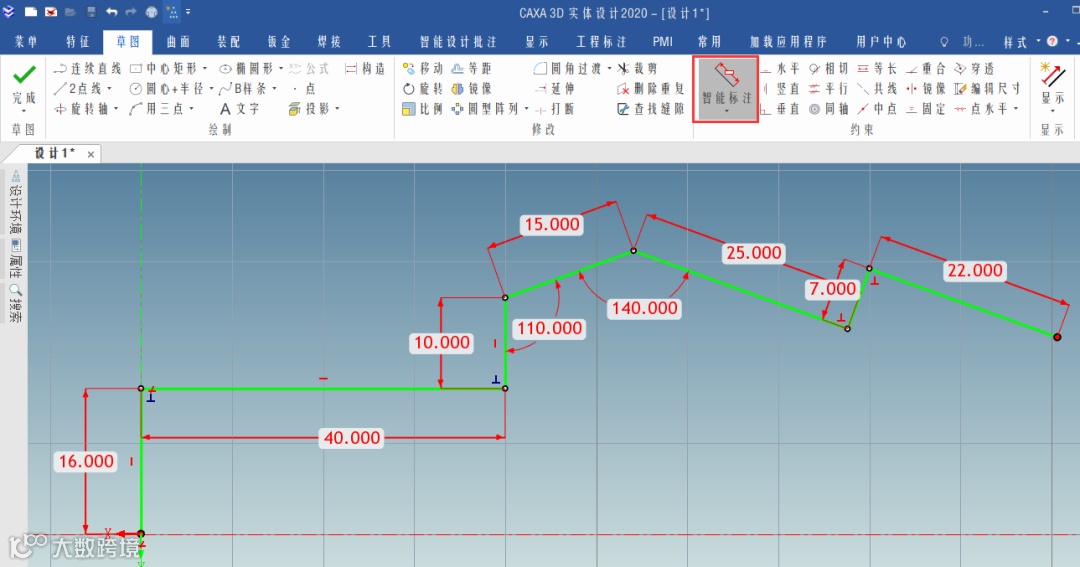 4、选择智能标注,对线段的长度和位置进行尺寸约束。