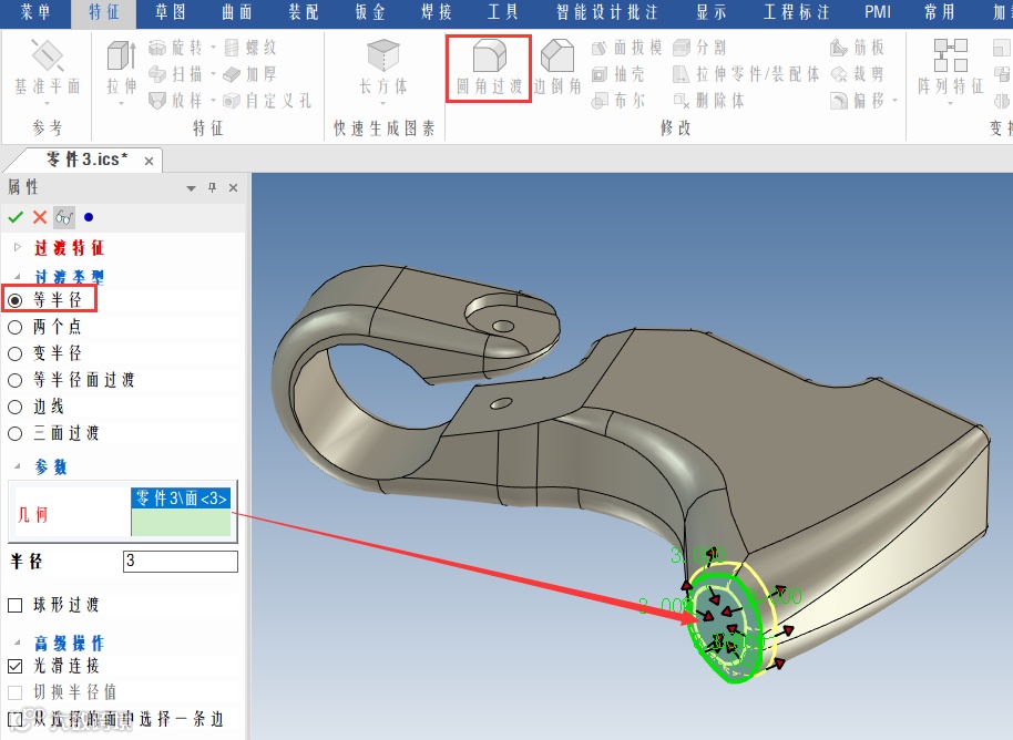 27、特征面板中选择【圆角过渡】设置为变半径,再选择需要做圆角过渡的边,然后在一个角点处单击绿色加点,出现小手图标,在半径栏中输入8。