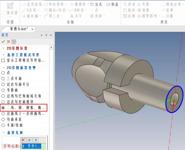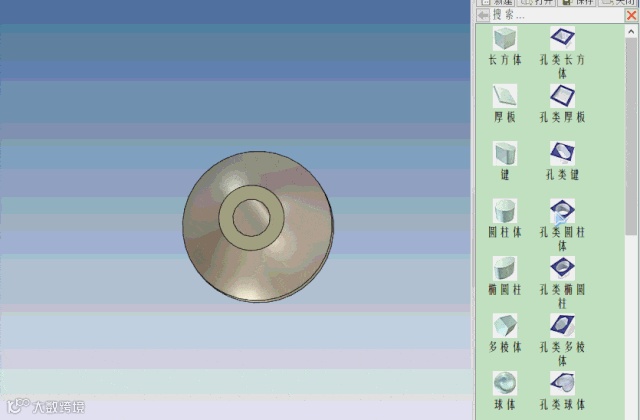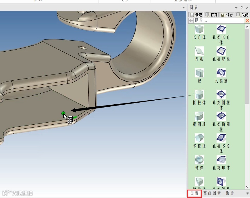 48、从图素元素库中拖放一个孔类圆柱体,再利用三维球调整位置,并旋转拷贝。