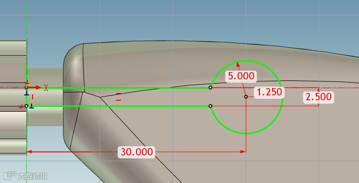 29、同理作变半径圆角过渡,起点处过渡半径为2mm,终点处过渡半径为8mm。