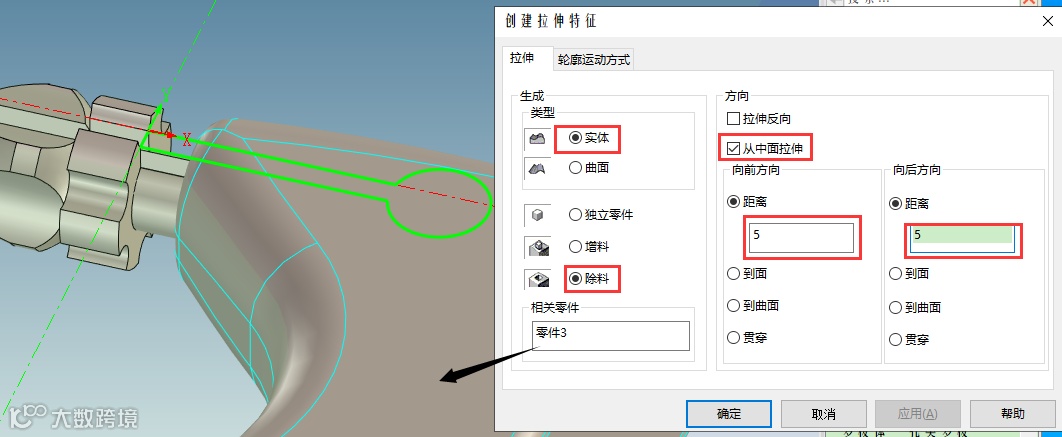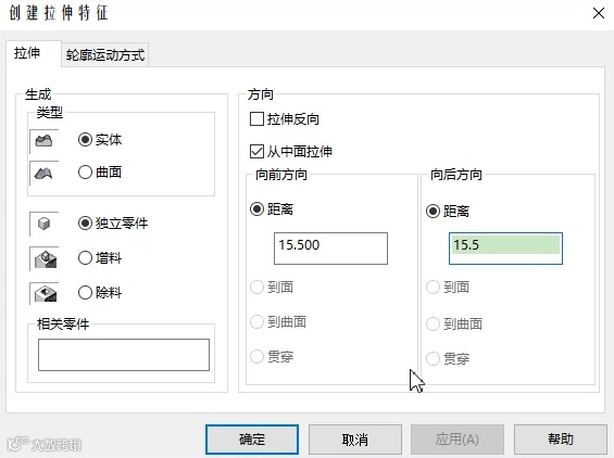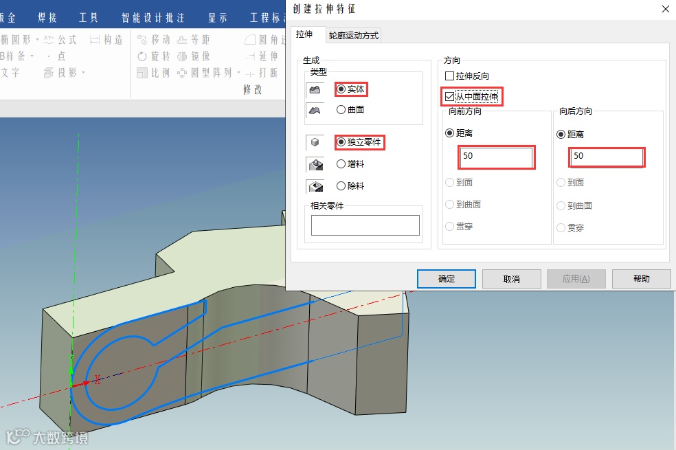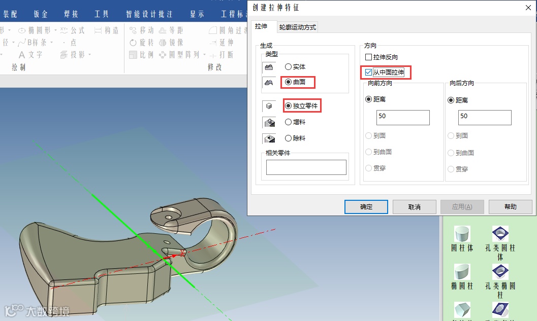 35、在草图上单击鼠标右键→生成→拉伸,设置拉伸特征生成曲面。