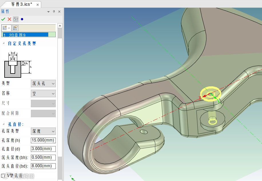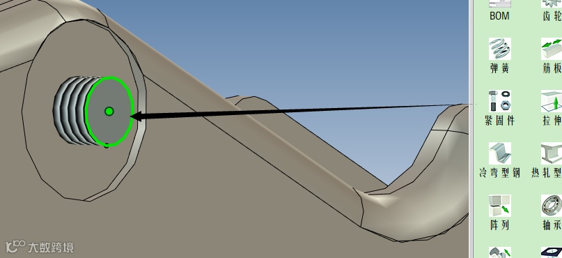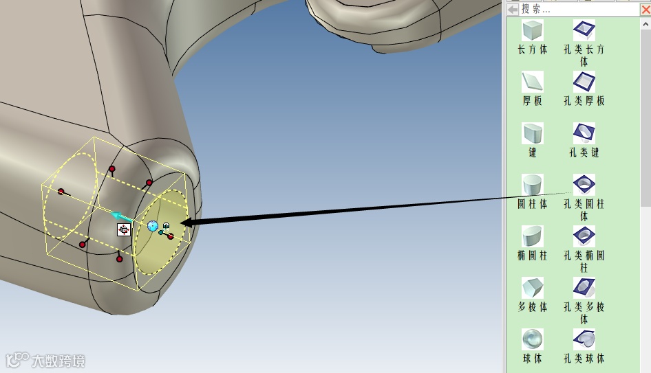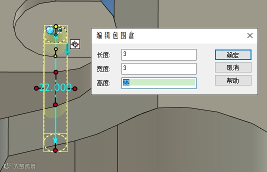 26、从设计元素库中拖放一个孔类圆柱体,智能捕捉到圆弧中心,在体控制手柄处单击鼠标右键,选择“编辑包围盒”,设置孔类圆柱体直径为3mm,长度为22mm。