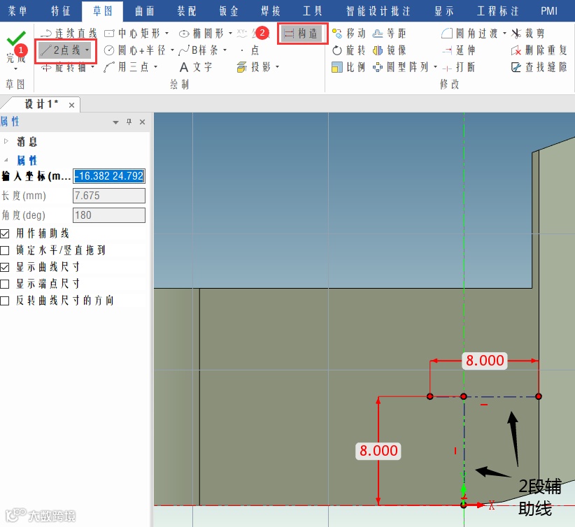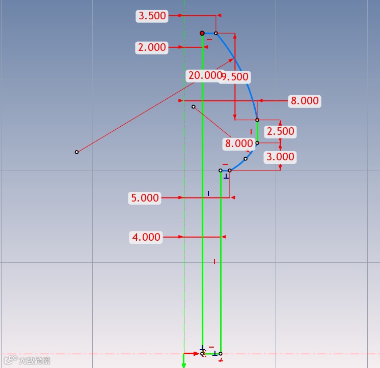 5、再交替选择【2点线】【用三点】画线段和圆弧,并用【智能标注】感觉头发尺寸和位置约束。