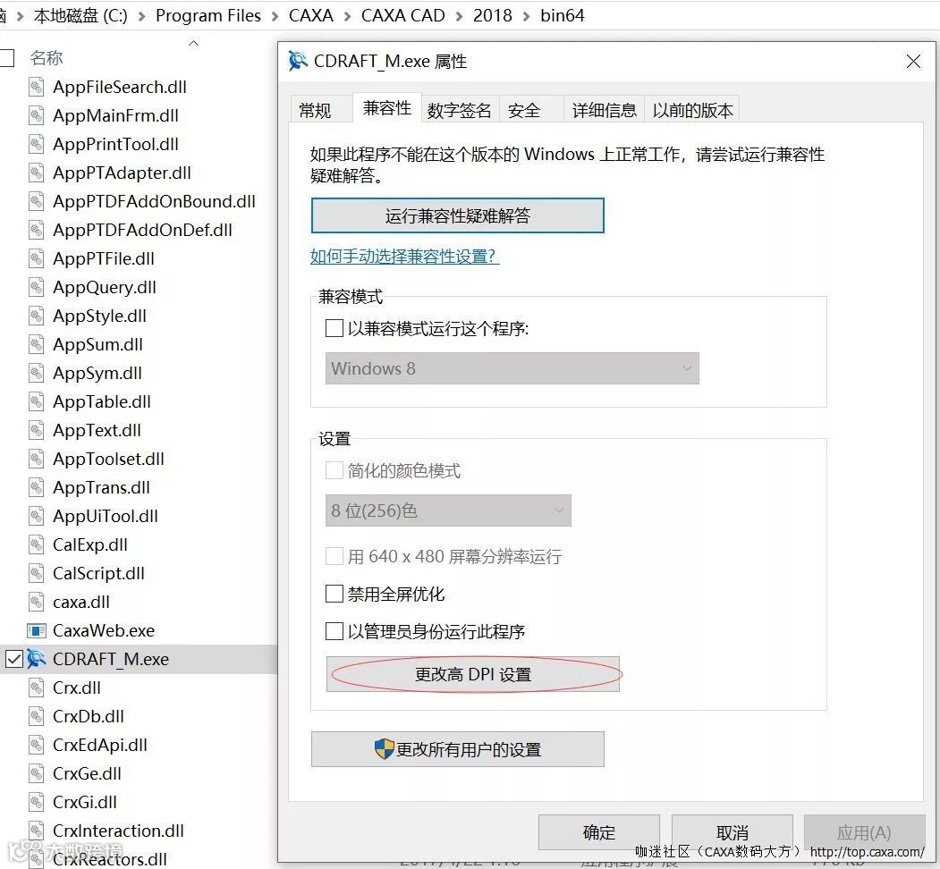 1、找到电子图板安装目录,选中CDRAFT_M.exe,右击,选择“属性”。在出现的窗口上,点击“兼容性”,选择“更改高DPI设置”。