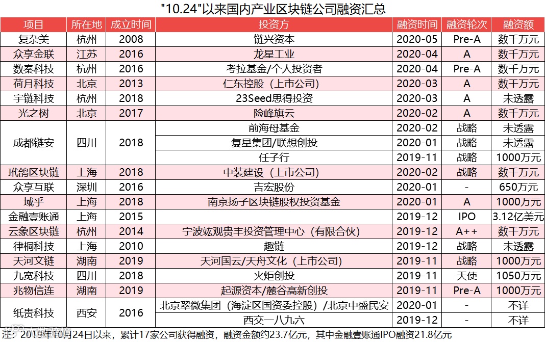 5月13日,复杂美宣布获得Pre-A轮融资,这是产业区块链类公司最近一次披露融资进展。