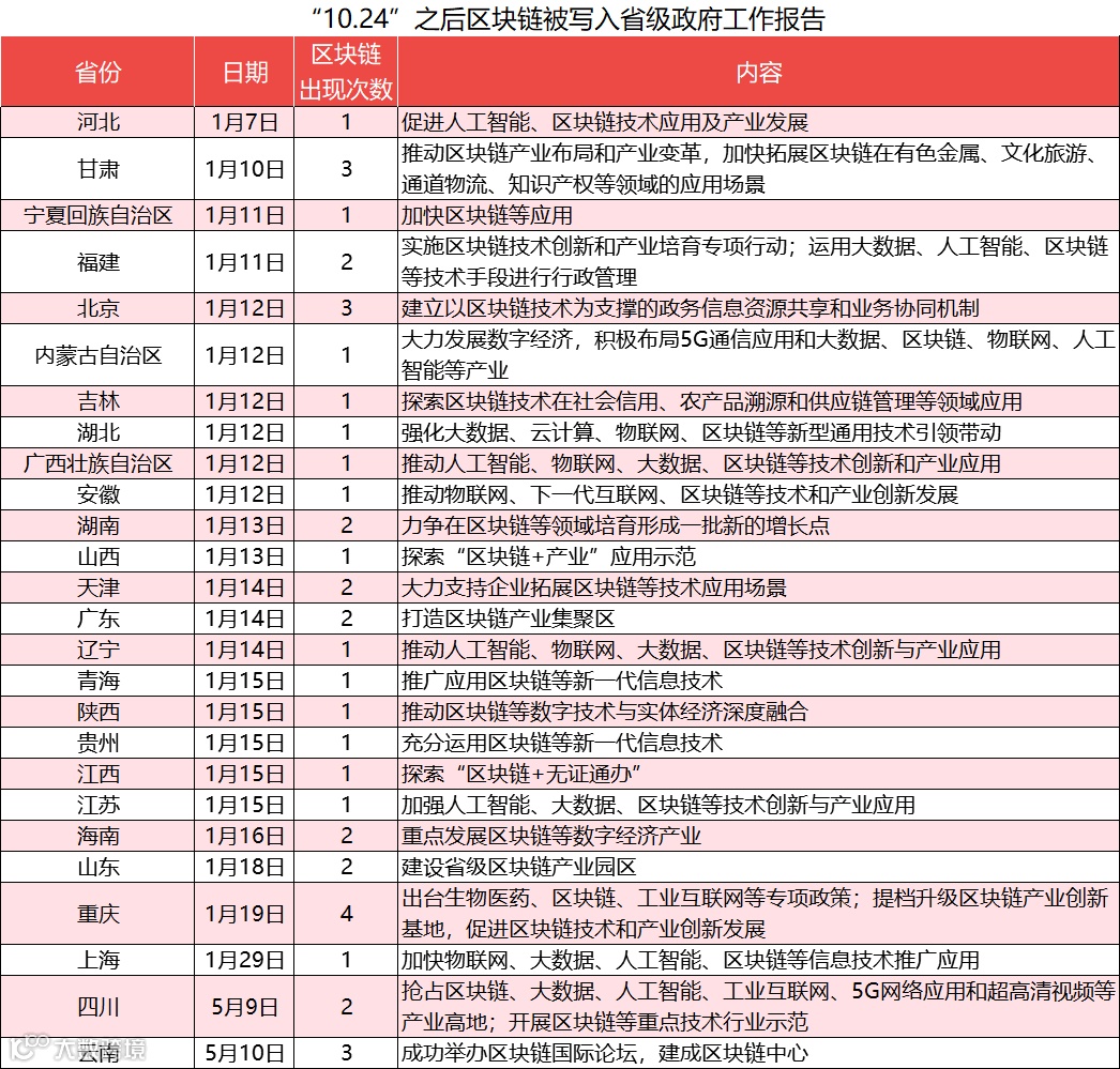 受“10.24”会议影响,全国26个省级行政单位将区块链写入政府工作报告,数量远超以往。