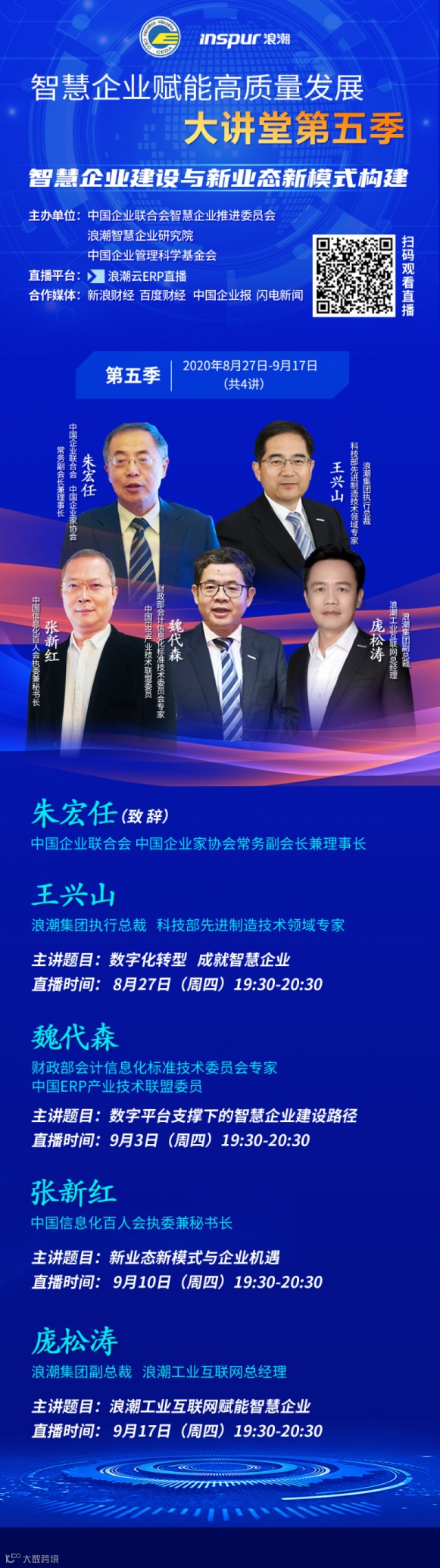 本季大讲堂围绕“智慧企业建设与新业态新模式构建”,将邀请科技部先进制造技术领域专家、浪潮集团执行总裁王兴山,财政部会计信息化标准技术委员会专家、浪潮集团副总裁魏代森,中国信息化百人会执委兼秘书长张新红,浪潮集团副总裁、浪潮工业互联网总经理庞松涛4位专家就数字化转型、新一代企业数字化平台、企业新业态新模式、工业互联网等热点话题授课。同时,中国企业联合会、中国企业家协会常务副会长兼理事长朱宏任将为本次活动致辞。
