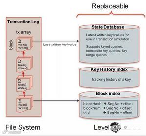 Fabric账本Ledger主要包含两块:Blockchain和State。Blockchain就是一系列连在一起的Block,用来记录历史交易。State对应账本的当前最新状态,它是一个Key-Value数据库。Fabric默认采用LevelDB, 可以替换成其他的Key-Value数据库,如CouchDB。在智能合约中对账本进行读写操作。