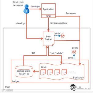 如下图所示,开发者创建客户端应用和智能合约(Chaincode),Chaincode被部署到区块链网络的Peer节点上面。通过Chaincode来操作账本,当你调用一个交易Transaction时,你实际上是在调用Chaincode中的一个函数方法,它实现业务逻辑,并对账本进行Get、Put、Delete操作。客户端应用提供用户交互界面,并提交交易到区块链网络上。