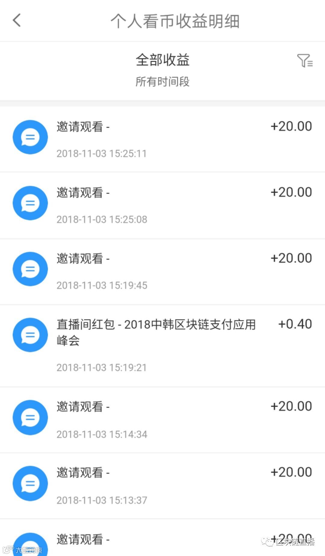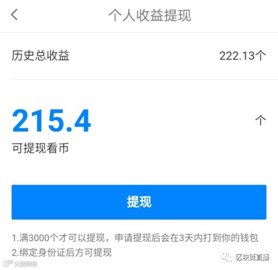 3.区块链掌上钱包,内置钱包功能,收益、打赏、赏金,您的区块链资产一目了然,在个人中心,点击看币明细,能够看到收益明细,直播间的收益是和个人收益是分开,看币满3000个即可提现,申请提现后会在三天内将看币打到你的钱包。