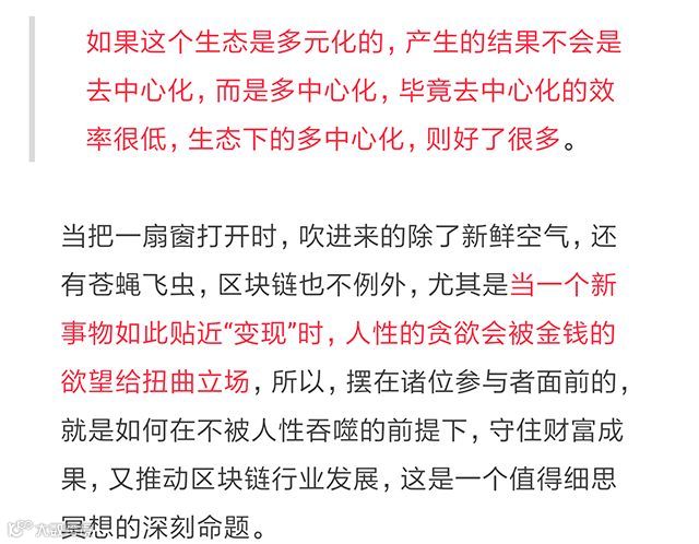 区块链世界里,关于中心化和去中心化的讨论已经结束了,最终的结论是:人们喜欢的不是去中心化,而是通过去别人的中心化,形成自己的中心,这个中心的本质是“说了算”。另外,分工比分权更重要,就像人的身体结构,虽然心脏是机理发动机、大脑是行为中枢,但脾胃肾也各司其职,重要的一塌糊涂。当一个生态趋于单一时,势必要分出一个中心,本质是通过竞争来迭代出最优选手,而所谓的去中心,不过是弱者的苟延残喘。