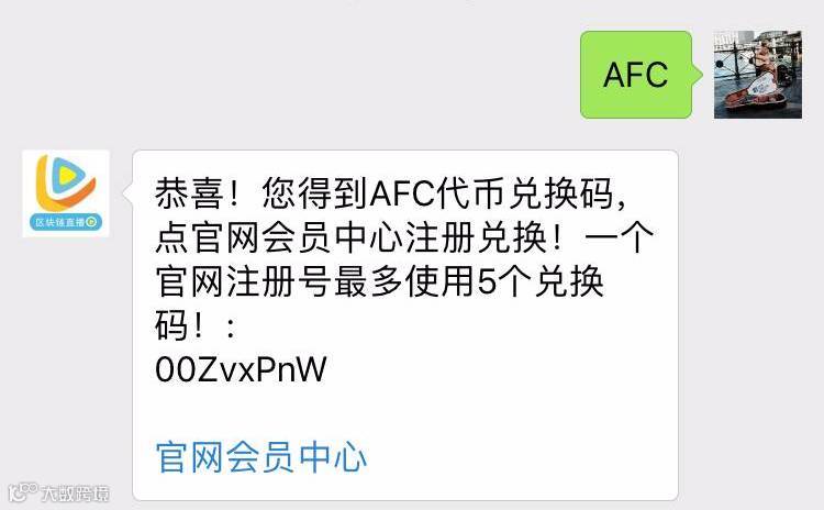 1、微信关注“区块链直播”订阅号,即可获得一个兑换码,输入AFC,还可再次获取一个AFC兑换码,每个微信号最多只能获取两个兑换码。