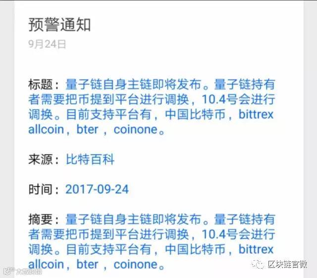 量子主链即将发布,10月4日进行调换,持有者需要把币提到平台调换,目前支持的平台有中比特,b网,allcoin,比特儿,coinone。(新旧链更换,以后老链失去价值了,赶紧转到上述平台,等待拍照调换。)