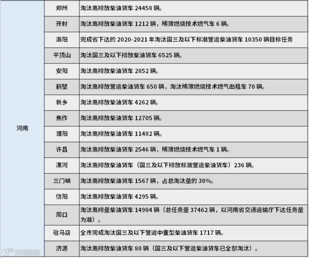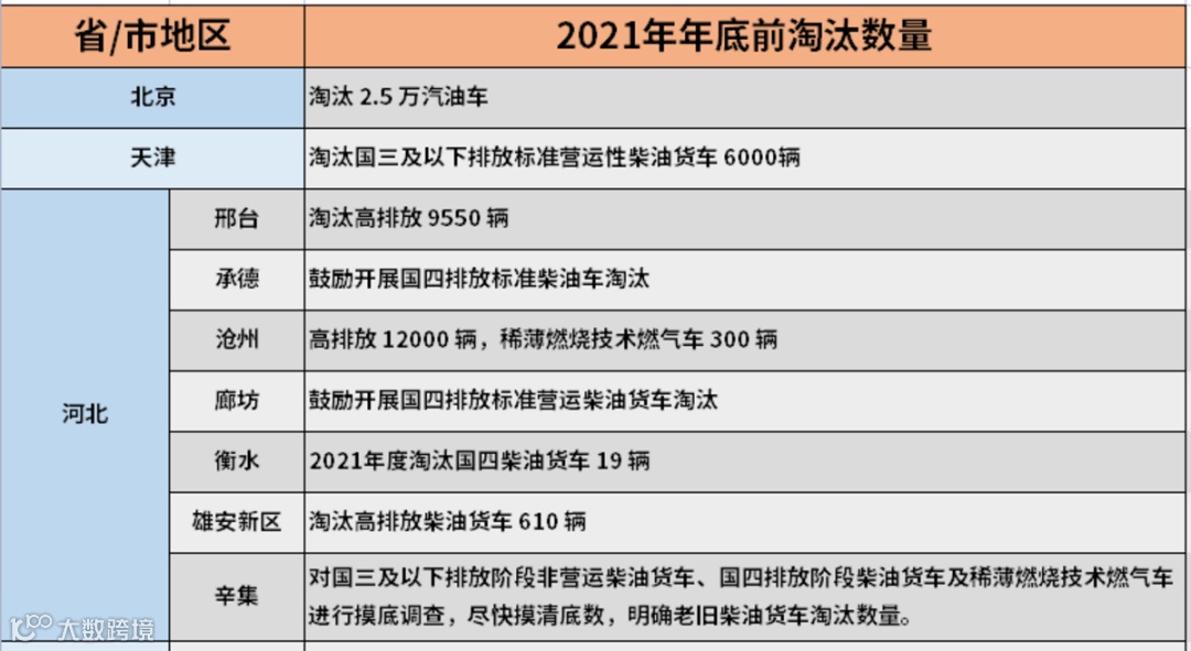 日前,生态环境部、国家发展改革委等10部委以及北京市、河北省等7省(市)政府联合印发《2021-2022年秋冬季大气污染综合治理攻坚方案》,从方案中了解到,在2021年年底前,各省市针对国三车淘汰最新的安排计划。