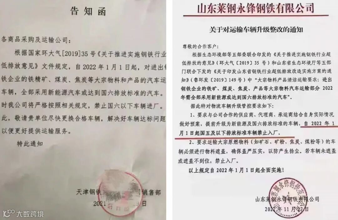 2021年以来,多地企业发布通知,自2022年1月1日起,国五及以下车型被禁止进入钢厂。