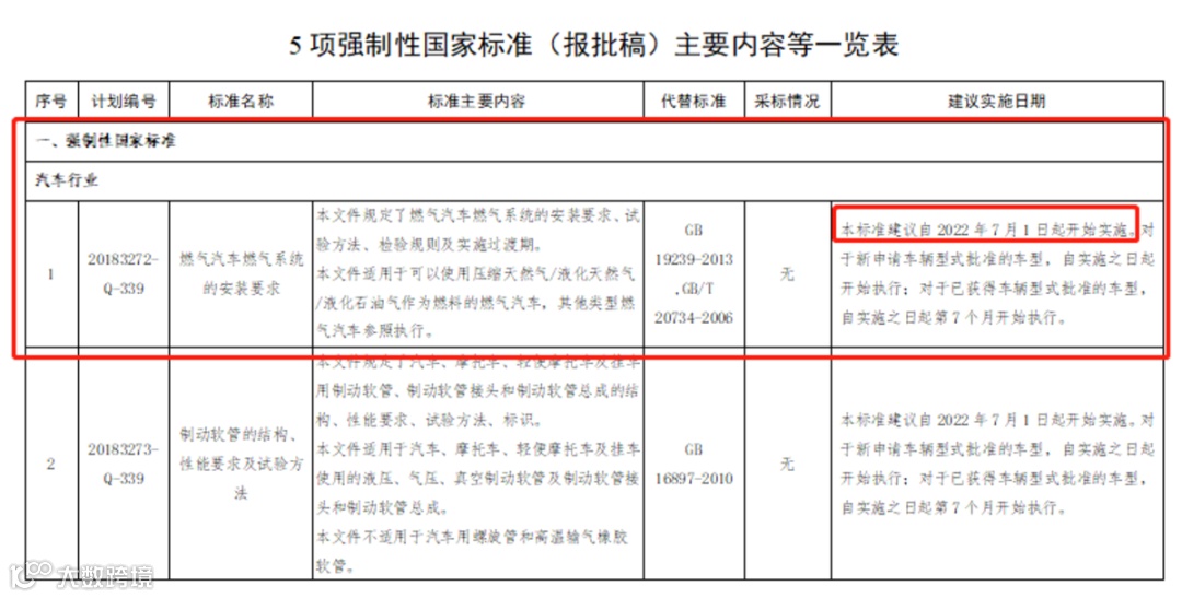 从工信部发布的文件来看,《燃气汽车燃气系统的安装要求》适用于可以使用压缩天然气/液化天然气/液化石油气作为燃料的燃气汽车,其他类型燃气汽车参照执行。