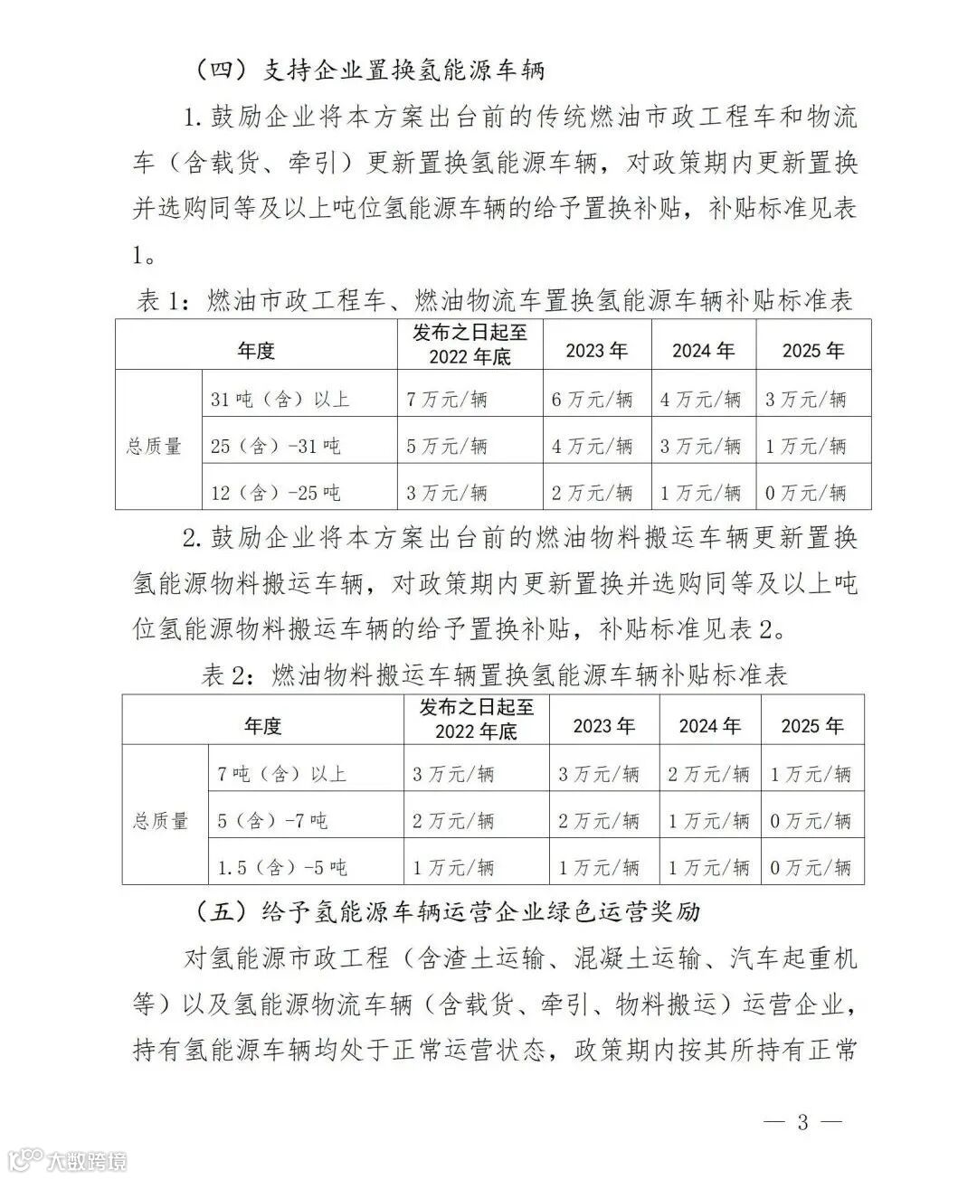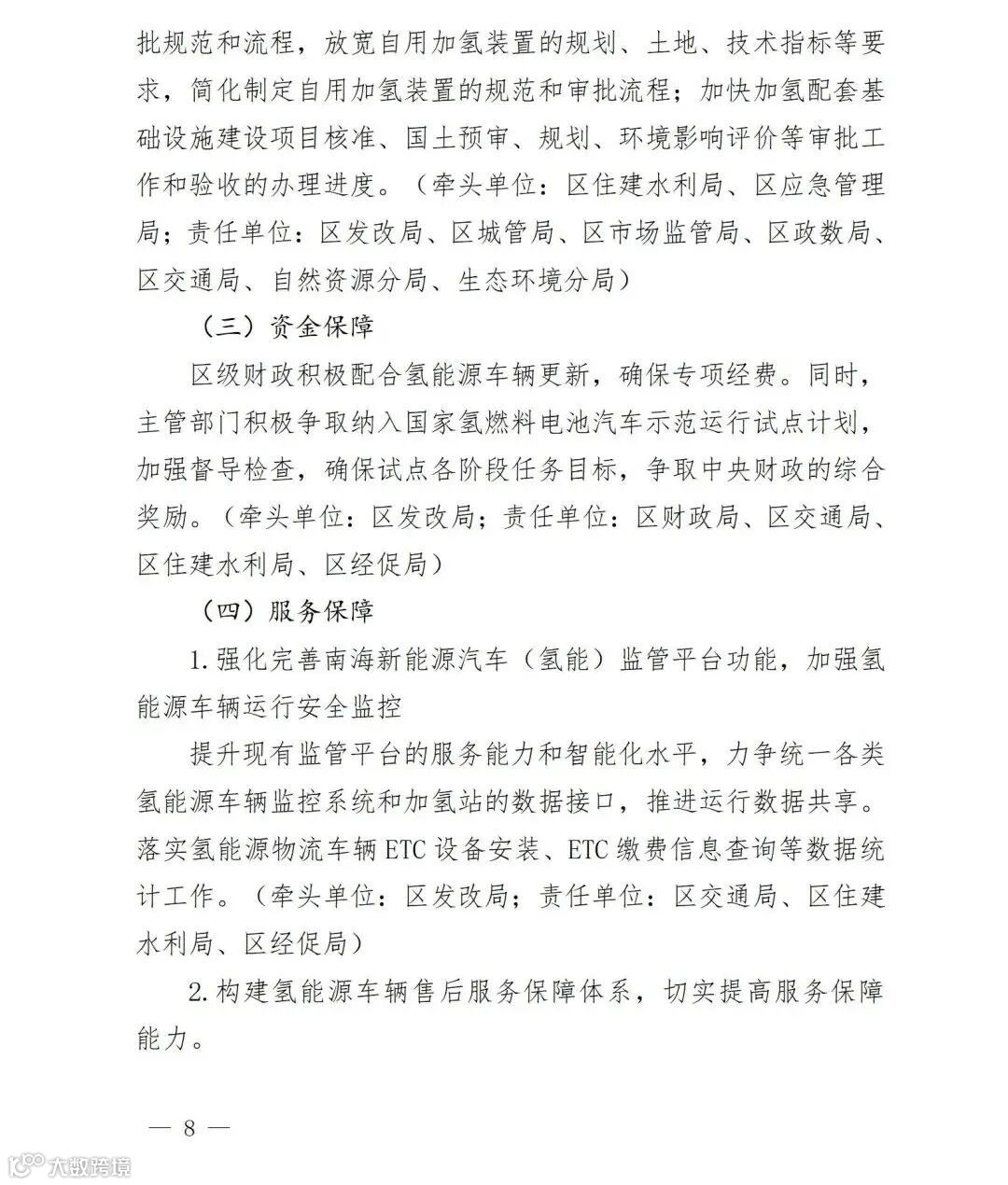 《方案》要求,加快基础设施建设项目审批。支持氢能源市政车辆集中停放管理,鼓励集中氢气供给就近建设自用撬装式加氢装置,参照自用加油装置审批规范和流程,放宽自用加氢装置的规划、土地、技术指标等要求,简化制定自用加氢装置的规范和审批流程;加快加氢配套基础设施建设项目核准、国土预审、规划、环境影响评价等审批工作和验收的办理进度。