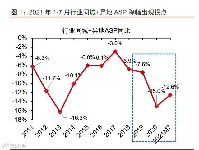 9 月 1 日起通达系陆续宣布全网派费每票提高 0.1 元,呼应监管提出保护快 递员合法权益政策方向,为前段揽件价格传导至商家提供了可能。2021 年 1-7 月行业同城 +异地 ASP 同比下降 12.6%,较 2020 年降幅收窄 2.4pcts。A 股上市韵达、圆通、申通自 3 月以来降幅逐月收窄,以圆通为例含派费 ASP 自 3 月降幅12.8%收窄至 8 月 5.4%,政 策升级带来价格战缓和,料 Q4 进一步收窄至个位数。