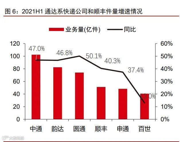 其 中中通、韵达、圆通件量增速较行业高 1.2pcts、1.0pcts、4.3pcts,圆通业务量增速表现 最优,申通、百世较行业增速低 8.4pcts、32.8pcts,料政策升级鼓励有序竞争、限制价格 恶意竞争,不改行业格局出清趋势,2021H1 四通一达叠加顺丰市占率 80.2%。