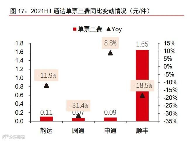 上半年单票净利仍延续较大的下跌趋势,2021Q1、Q2 通 达系单票净利降至 0.02 元、0.06 元。依靠不必要的低价亏损件或以利润换取短期市场份 额增长的做法,既非明智也不可持续,随着监管政策升级叠加快递龙头调整经营策略,料 2021Q4 单票净利有望迎来拐点。