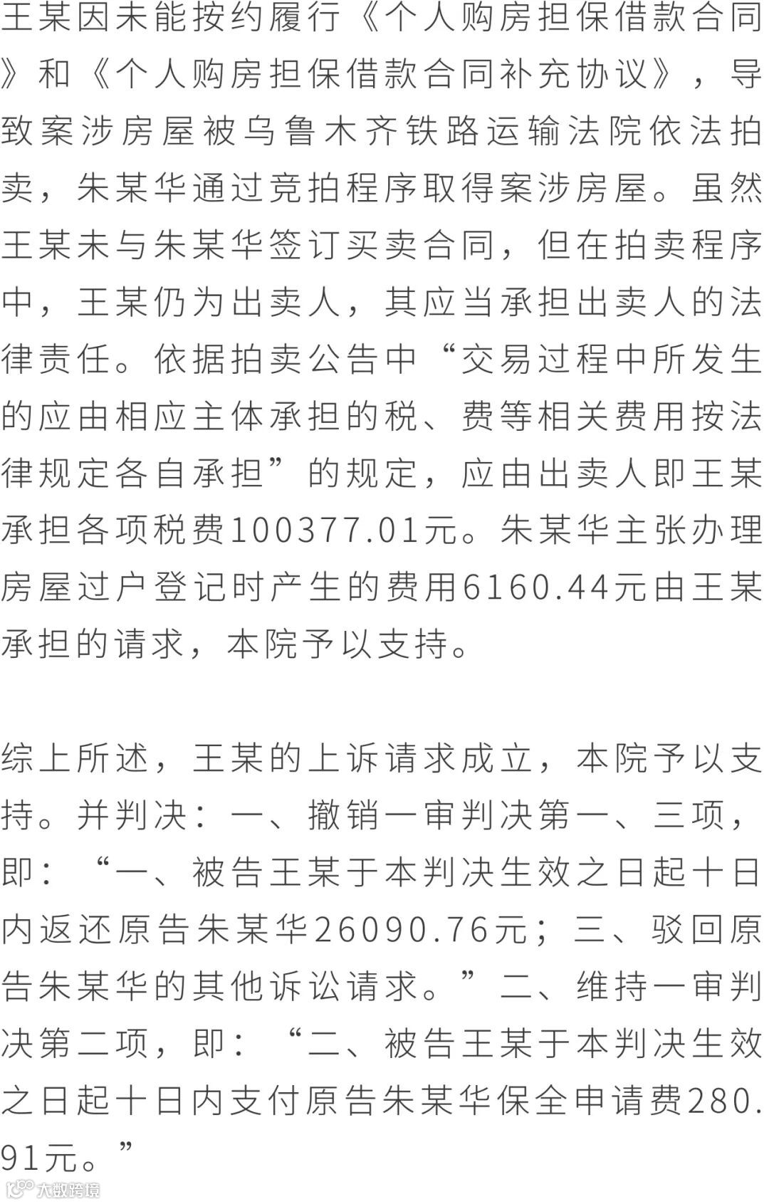 2024年1月7日,朱某华以1269829.57元的价格成功拍下案涉房屋。在办理房屋过户手续时缴纳住宅专项维修资金19930.32元及各类税、费100377.01元,合计120307.33元。2024年4月26日,乌鲁木齐铁路运输法院向朱某华退税、费合计94216.57元。现朱某华认为,乌鲁木齐铁路运输法院未退的26090.76元,应由王某退还,诉至一审法院,引发本案诉讼。