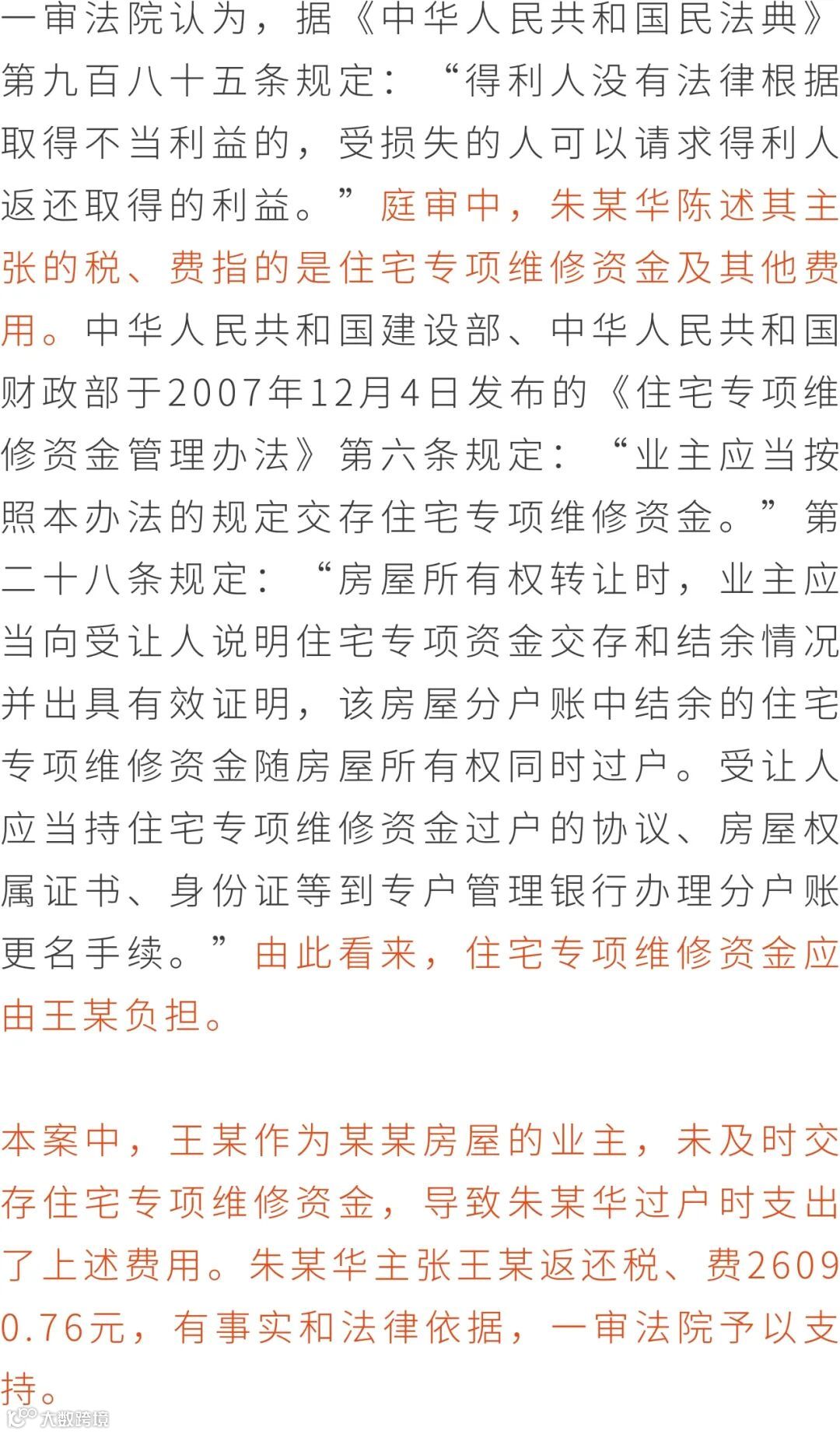 案涉房屋产生的专项维修资金并非房屋办理过户中产生的费用,而系业主在办理房屋入住手续前,将首期住宅专项维修资金存入住宅专项维修资金账户。朱某华通过司法拍卖程序竞拍取得案涉房屋,成为房屋业主,应当承担该房屋项下相应的义务,即将专项维修资金存入住宅专项维修资金专户。