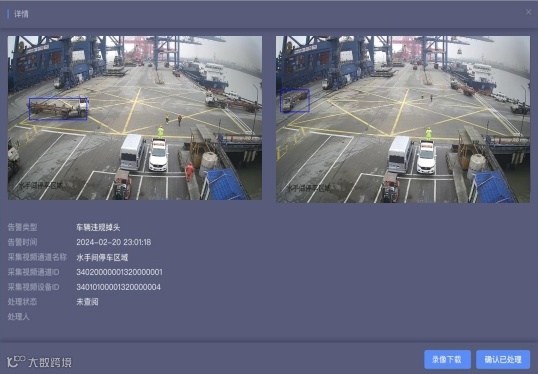 人车作业 合规监测:利用视频AI分析技术,对园区人、车作业不合规行为进行主动检测,预警提示,如异常着装、车辆违停、车辆拥堵、重箱区司机下车行为等。