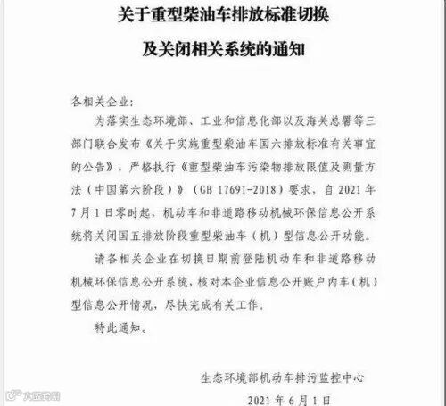 生态环境部机动车排污监控中心发布《关于重型柴油车排放标准切换及关闭相关系统的通知》,表示:自2021年7月1日零时起,机动车和非道路移动机械环保信息公开系统将关闭国五排放阶段重型柴油机车(机)型信息公开功能。