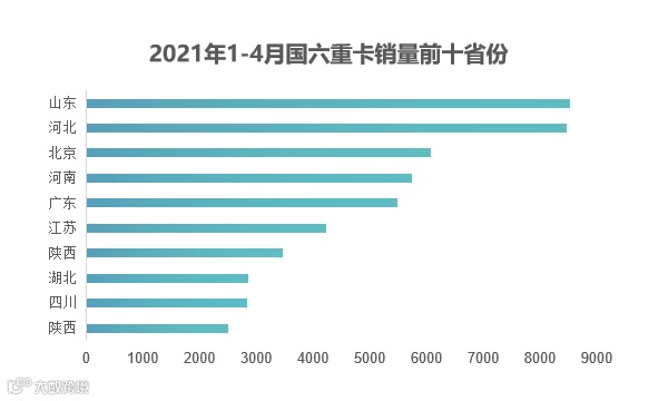 根据相关数据显示,2021年1-4月,国六柴油车65887辆,占重卡总量的10.1%。其中,排名前十省份为山东、河北、北京、河南、广东、江苏、陕西、湖北、四川和陕西。