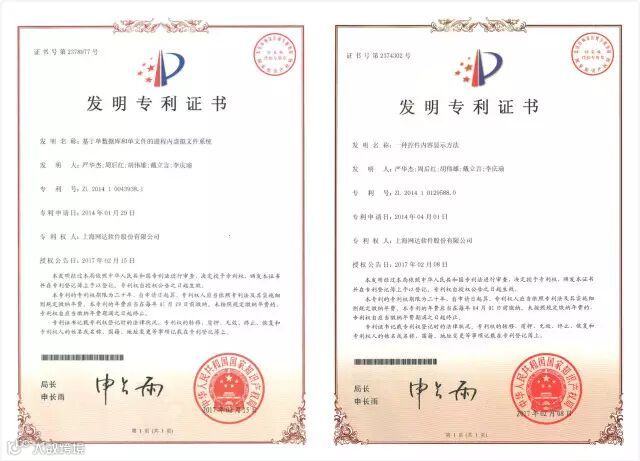 2017年3月初,由网达软件自主研发的“基于单数据库和单文件的进程内虚拟文件系统”和“ 一种控件内容显示方法”获得国家知识产权局颁发的发明专利证书。