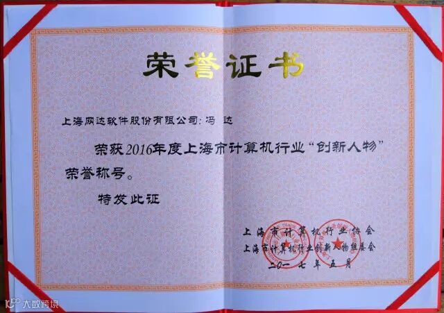 上海网达软件股份有限公司董事长冯达获得“2016年度上海市计算机行业创新人物”荣誉称号。