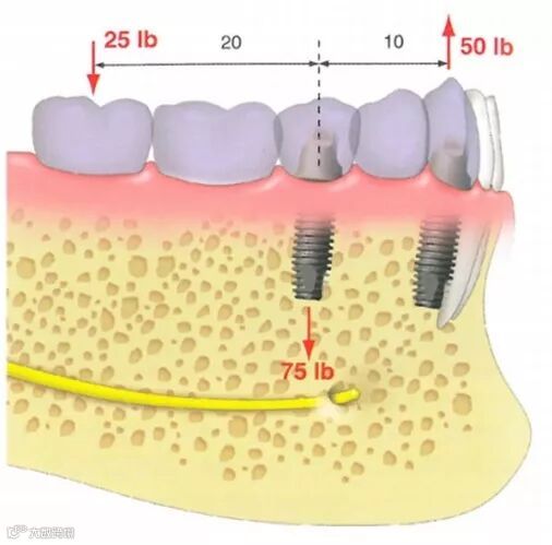 无牙颌种植分段式固定修复的优势是维护方便,但种植体数目要求相对会多,位置特定。而一段式修复对数目和种植体的位置要求相对低。因上颌窦或下牙槽神经的限制,后牙区骨量不足,倾斜植入和适当悬臂修复是可选方案。无牙颌种植固定修复的种植体三维位置设计同样需兼顾骨量、角化黏膜和修复体位置:通过骨修整改变剩余可用骨宽度;通过切口和瓣的转移,可一定程度改变角化黏膜的分部;通过角度复合基台可纠正种植体平行度差异和改变螺丝孔穿出的位置。并且避免或是减小悬臂梁,一般不超过10mm,悬臂梁把颌力传递至骨内会转化成拉伸力和剪切力,同时会使应力极大增加,对骨结合与种植长期稳定性极为不利,如图6.1所示。在无牙颌种植中,位点相关的AP距(图6.3)也应仔细设计,使整个种植系统能良好承受颌力。