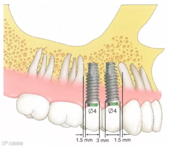 ● 近远中向:距邻牙至少1.5mm,种植体之间至少3mm;