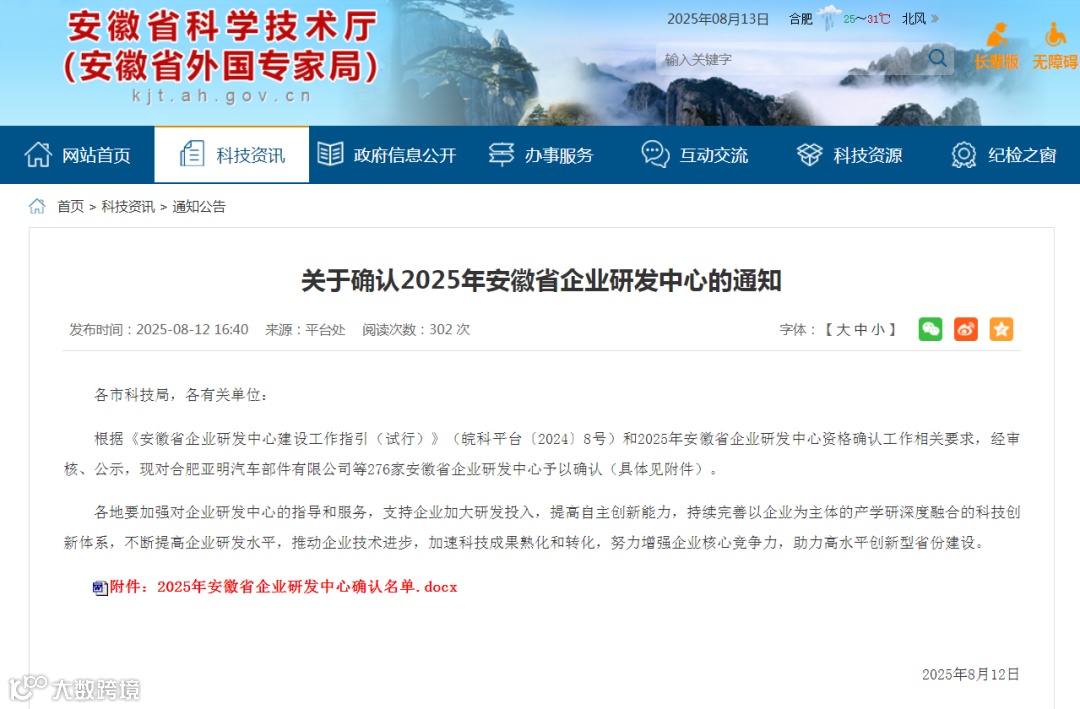 8月12日,安徽省科学技术厅根据《安徽省企业研发中心建设工作指引(试行)》(皖科平台〔2024〕8号)和2025年安徽省企业研发中心资格确认工作相关要求,经审核、公示,发布了《关于确认2025年安徽省企业研发中心的通知》。经过严格评审,云轨科技凭借其卓越的研发能力和突出的创新成果,成功入选安徽省企业研发中心名单,标志着云轨科技在科技研发领域获得省级权威认可。