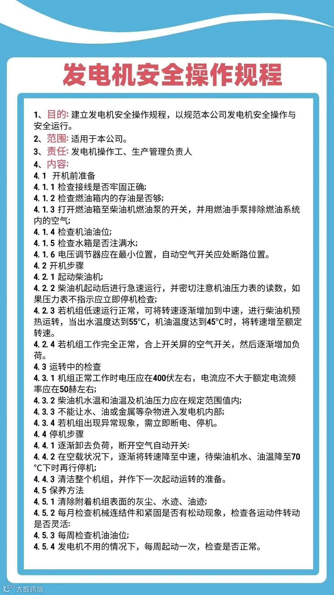 4、每30分钟检查一次水温,水温超过80.℃立即停止发电机。