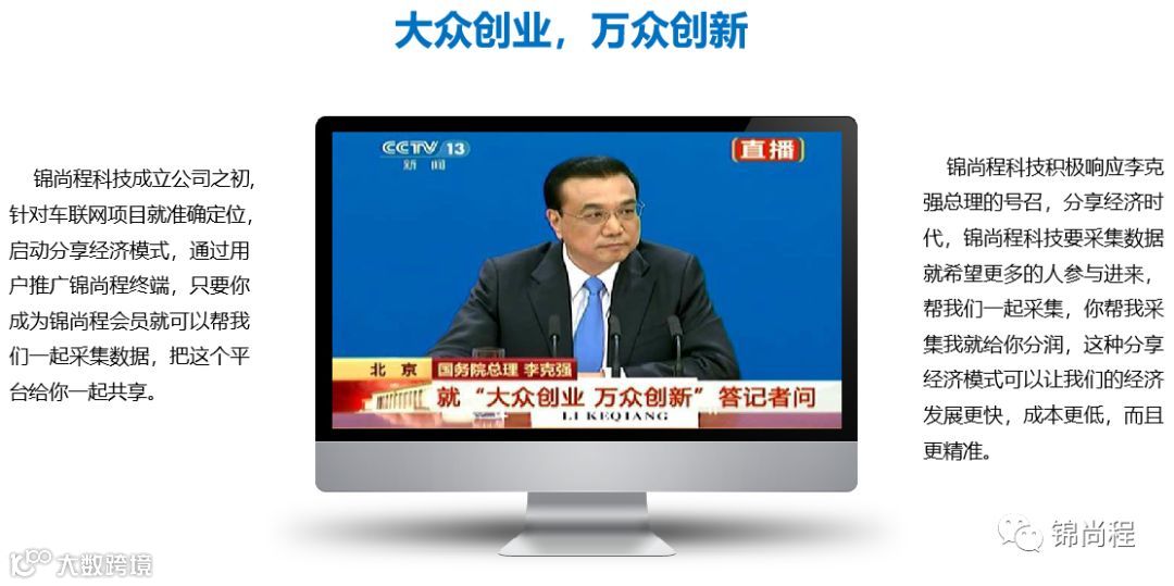 现在很多人都看懂了锦尚程,知道锦尚程实质是一家车联网大数据公司,他要通过大数据运营达到大数据变现,然后整合汽车后市场全产业链,通过搭建大平台,搜集大数据,形成大流量,做成大产业,让全体会员和股东享受资本盛宴。