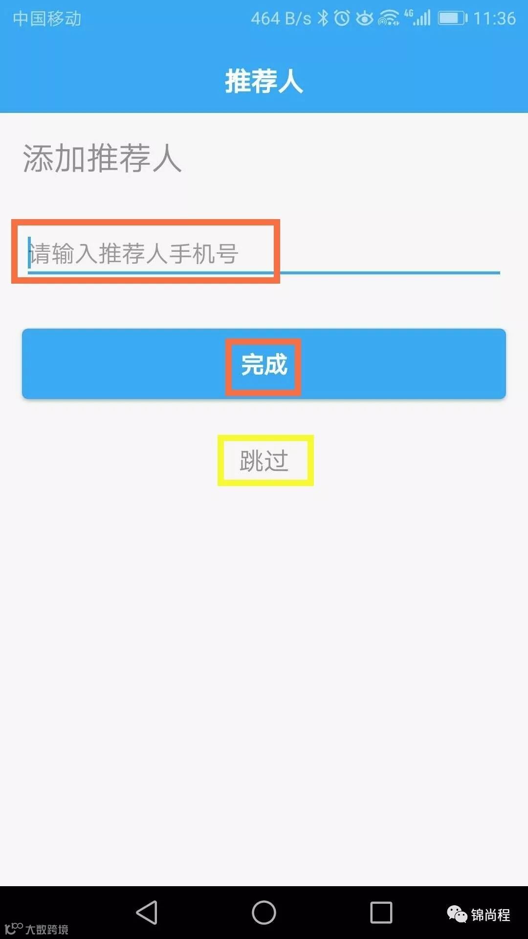 如果没有推荐人,可以点击跳过;如果有,输入推荐人手机号,点击完成