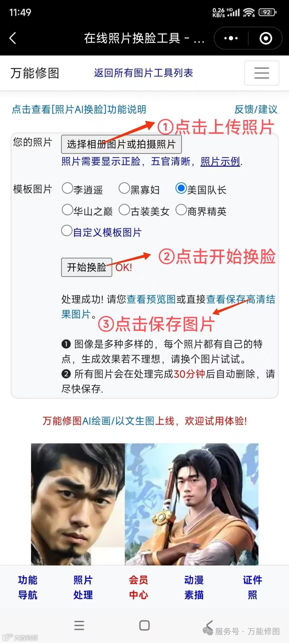 4.点击“开始换脸”按钮,完成后保存高清图片即可。