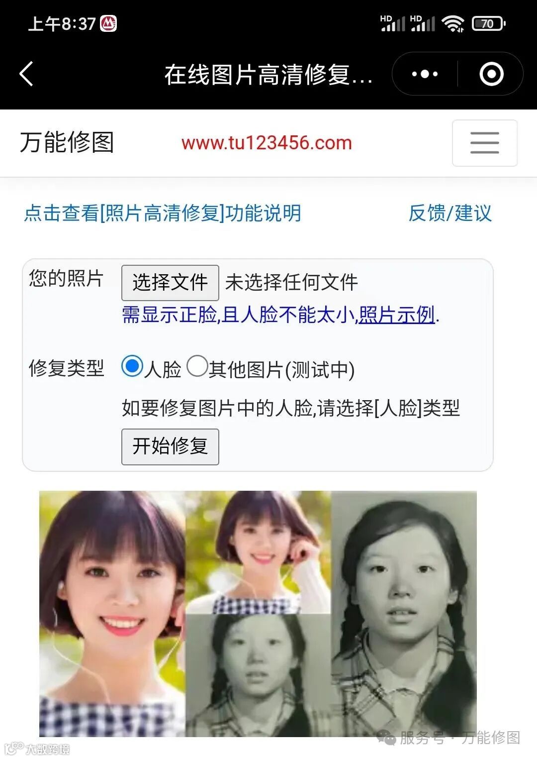 3. 在线工具如"万能修图"小程序:无需安装软件,直接在网页上上传图片,便可以轻松将照片高清修复,提升图片的清晰度,操作简单,适合初学者。