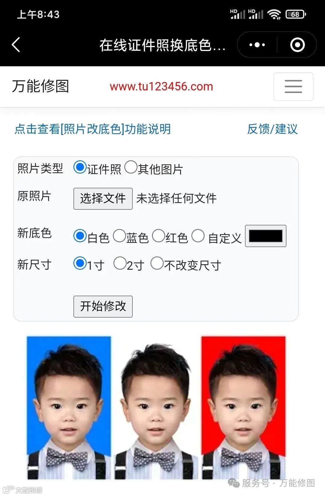 当然,你也可以选择一些免费的在线证件照换底色工具。如:“万能修图”小程序,这些证件照换底色工具通常操作简单,只需要上传照片,选择想要的背景色,一键搞定!是不是很方便?