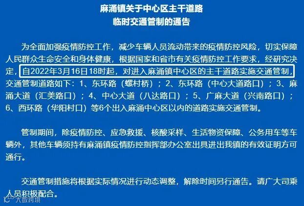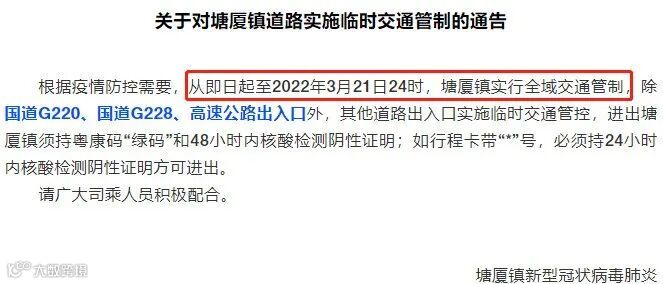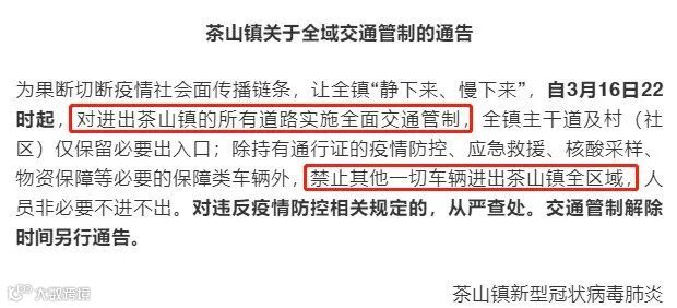 同时,东莞东坑、横沥、常平、石排等地均发布通知,从3月15日10时起,实施全域交通管制。(详细查看:东莞防控措施升级,多地实施全域交通管制!)