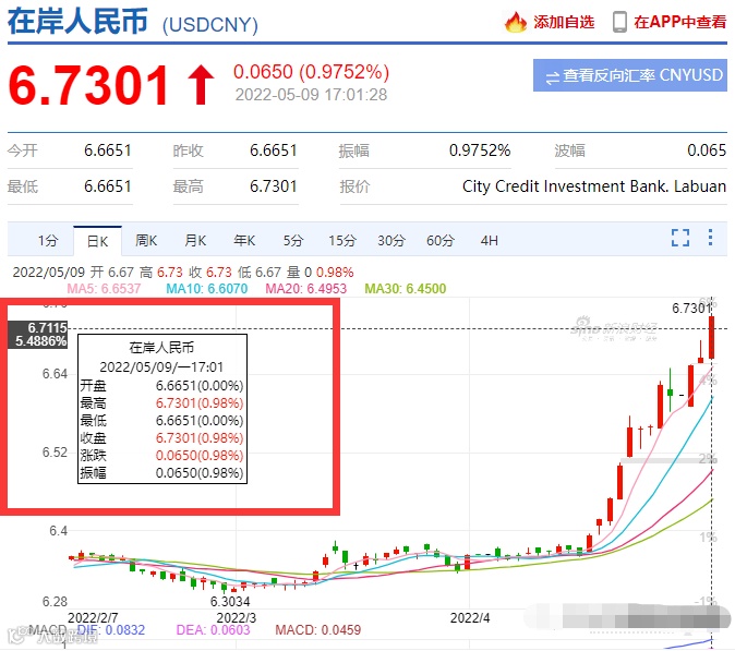 自4月19日以来,人民币汇率连续跌破多道关口,半个月时间跌超3000基点。5月6日,离岸人民币兑美元汇率盘中一度跌破6.73,在岸人民币兑美元汇率日内贬值幅度亦超500点。