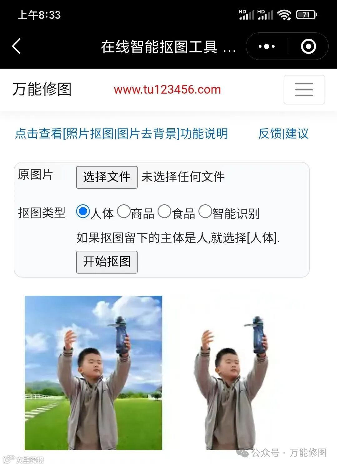万能修图:万能修图小程序是一个在线AI图片处理工具平台。其包括免费抠图功能。上传图片,单击“移除背景”按钮,即可快速删除背景。