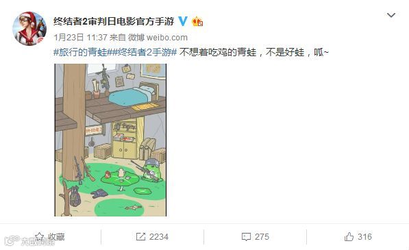 在2017年末的吃鸡游戏大潮中,《终结者2:审判日》一直以独有的营销理念和特色的游戏玩法吸引全球超过9000万玩家的追捧。在这波“旅行青蛙”的借势营销中,终结者2丝毫不避讳游戏借势营销的危险,不但扩大了自身品牌的声量,更是从吃鸡大潮中脱颖而出。