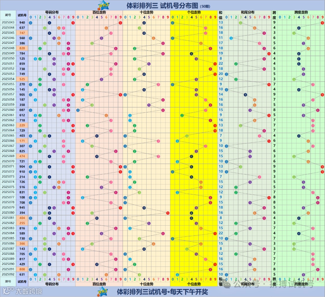 排列三试机号走势分布图(更新至2025092期)