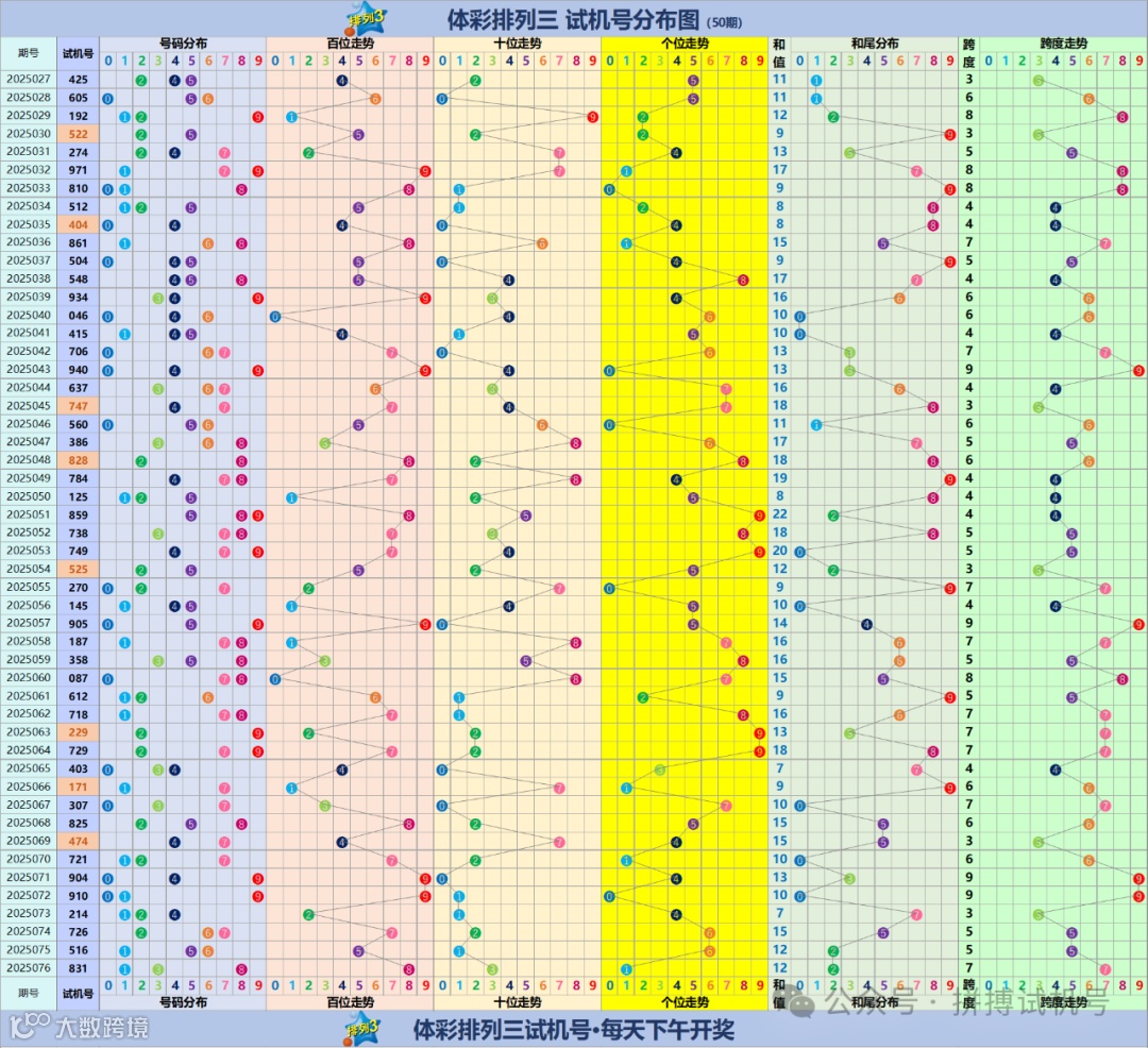 排列三试机号走势分布图(更新至2025076期)