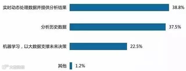 根据数据显示,38.8%的企业使用实时动态处理大数据并提供分析结果;37.5% 的企业分析历史数据;通过机器学习,辅助企业管理者更好地决策的企业占比为22.5% 。