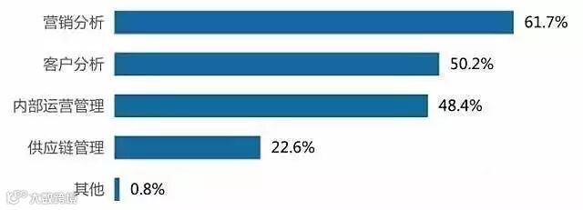 大数据应用最广泛的top3领域是营销分析、客户分析和内部运营管理。其中,营销分析占比6成以上;50.2%的企业使用大数据进行客户分析;48.4% 的企业运用大数据进行内部运营管理。